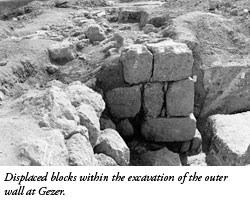 The city of Gezer was also severely shaken. The outer wall of the city shows hewn stones weighing tons that have been cracked and displaced several inches off their foundation. The lower part of the wall was displaced outward (away from the city), whereas the upper part of the wall fell inward (toward the city) still lying course-on-course.3 This indicates that the wall collapsed suddenly.